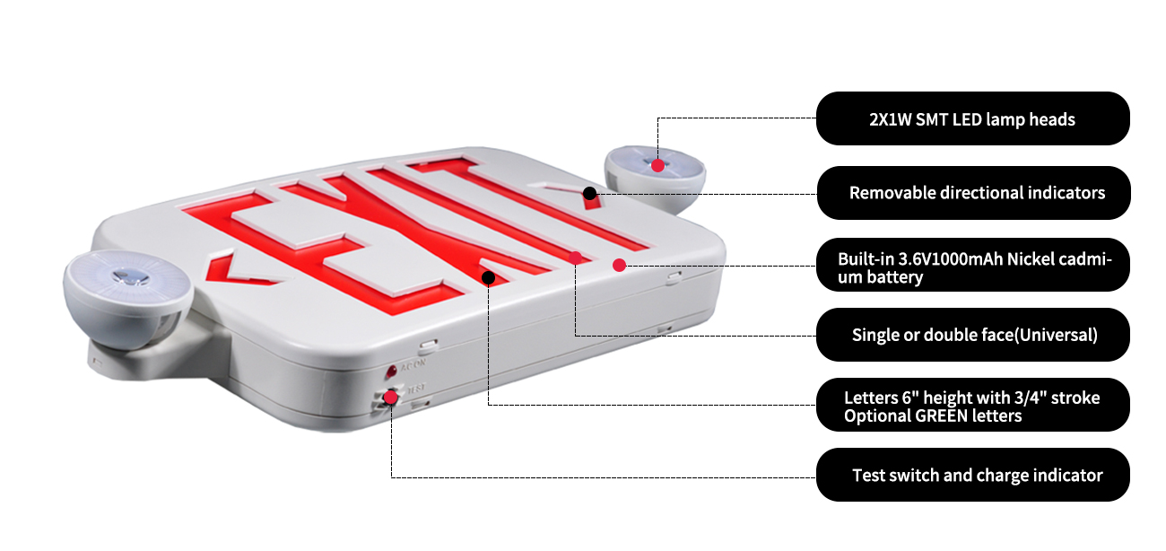 Kombo Exit Sign / Darurat yang Efisien dan Aman. Hemat uang membeli produk 2-in-1 ini. Baterai Ni-Cad yang tahan lama dan rendah. Bekerja pada 120 - 277 Vac Universal Voltase. Faceplate termasuk panah knock-out kiri/kanan. Fixture adalah 1 atau 2 sisi. Produk terdaftar dan memenuhi kode darurat NFPA 101, OSHA dan UL 924. Sebagai pencahayaan rumah, komersial dan industri, sempurna untuk lorong, koridor, rumah sakit, apartemen, gereja, mal perbelanjaan, supermarket, sekolah, hotel, pub, restoran, gudang, gedung kantor, dll.