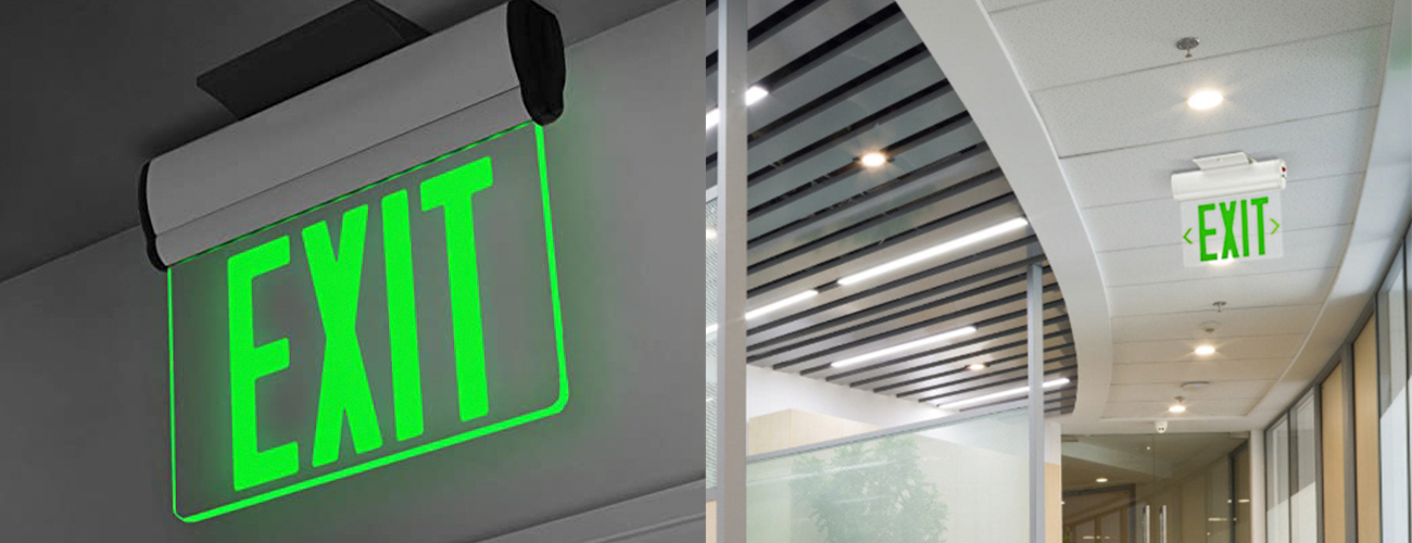 *Illumination - Seri tanda keluar yang menyala tepi ini memberikan iluminasi yang dipimpin umur panjang. Unit ini dibangun dengan papan LED output tinggi hijau.  Konsumsi energi dinilai kurang dari 3 watt untuk unit model AC saja. Unit cadangan baterai konsumsi energi dinilai kurang dari 1 watt.