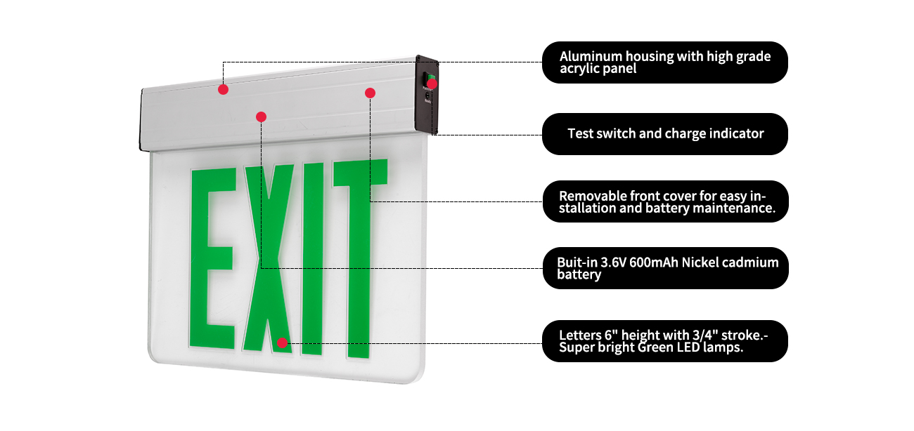 *Illumination - Seri tanda keluar yang menyala tepi ini memberikan iluminasi yang dipimpin umur panjang. Unit ini dibangun dengan papan LED output tinggi hijau.  Konsumsi energi dinilai kurang dari 3,5 watt untuk unit model AC saja. Unit cadangan baterai konsumsi energi dinilai kurang dari 1 watt.
