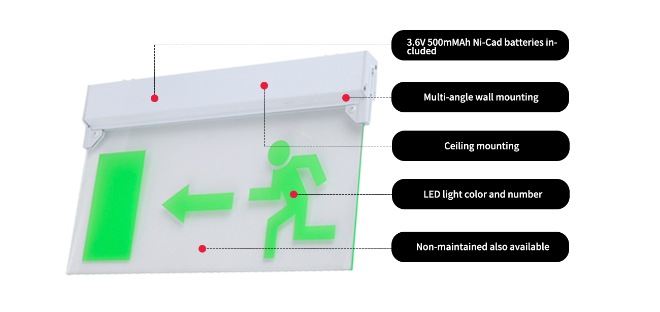 *Cadangan Baterai Daya Darurat-Tanda Exit LED dirancang dengan baterai Ni-Cad 3.6V 500mAh bebas perawatan yang memberikan durasi darurat minimum 6 jam. Pengisian ulang waktu baterai adalah 24 jam.